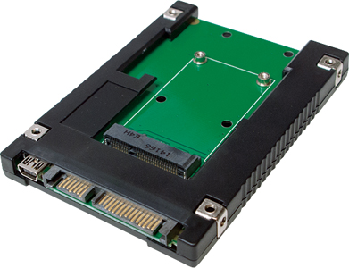 Adaptateur pour intégrer un SSD mSATA dans un emplacement SATA 2,5". Compatible USB 2.0 (mini USB femelle). Configurable comme disque bootable dans le BIOS. Interfaces SATA 7+15 pins et mSATA, compatible Intel-type et USB-type mSATA SSD.