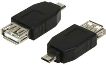 Adaptateur Micro USB mâle vers USB-A femelle, disponible en version monobloc compacte ou câble souple 20 cm. Compatible USB 2.0, idéal pour connecter tablettes et périphériques en classe.
