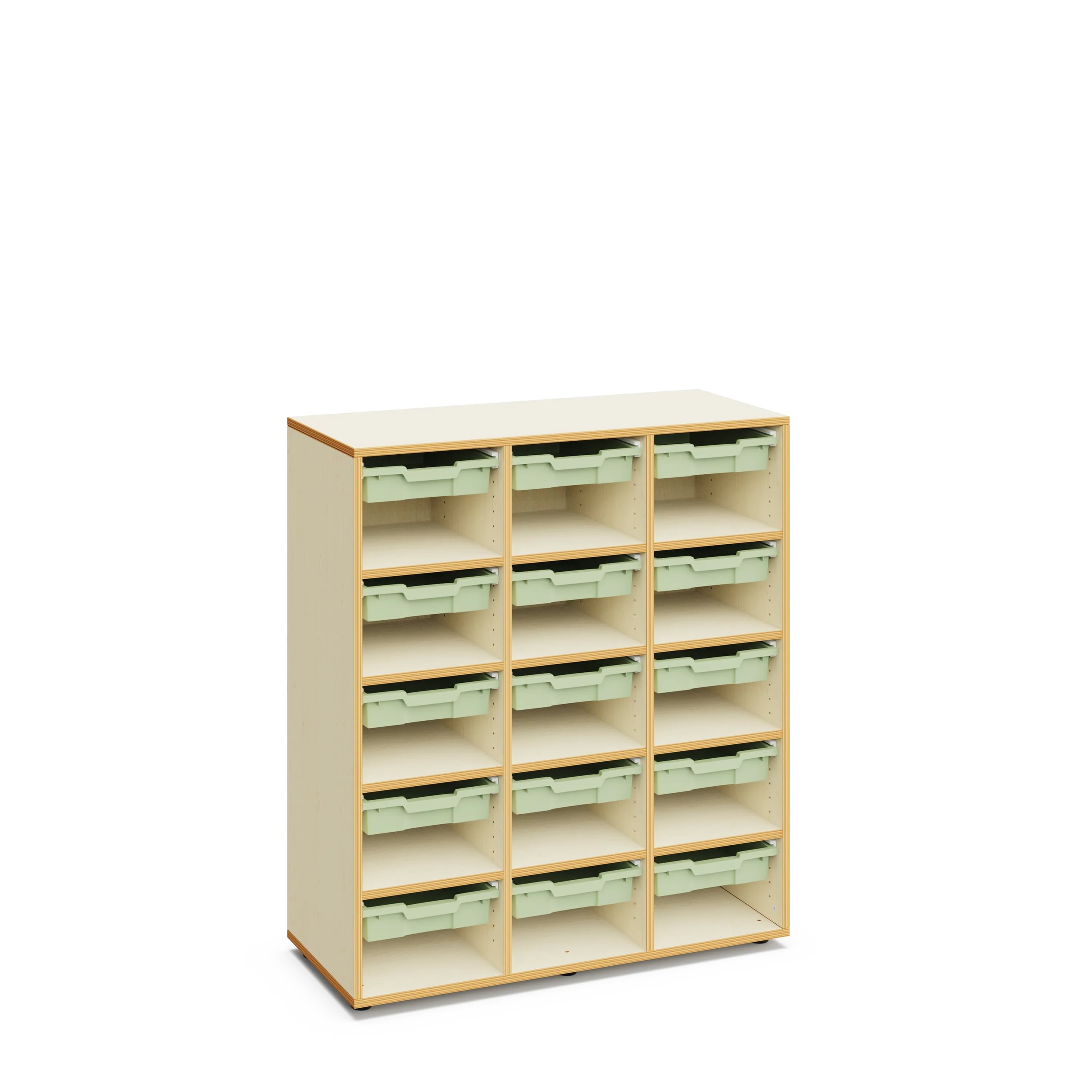 Armoire ANNIE avec bacs : meuble de rangement en bois équipé de bacs en plastique, parfait pour organiser le matériel scolaire, les jouets ou les fournitures. Sa conception modulaire permet une adaptation facile à tout type d’espace éducatif.