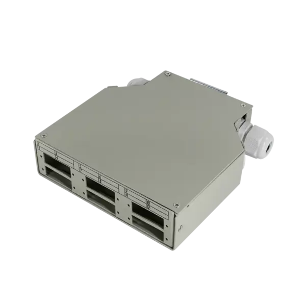 Boîtier d'épissures et distribution fibre LC/SC sur rail DIN, métallique gris RAL 7035. Vide pour pigtails et coupleurs. Compatible 6×SC Duplex, LC Quad ou 8×LC Duplex, SC Simplex. LOGILINK FB5000.