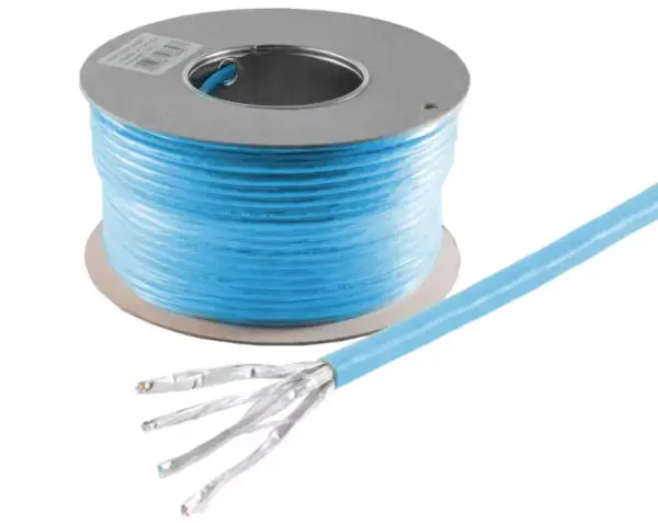 Câble réseau Cat8 S/FTP monobrin LSOH bleu, 100 m. Catégorie 8 Classe I, 2000 MHz, débit jusqu'à 40 Gbps. Double blindage PIMF. Conducteur cuivre AWG22, Ø 8,2 mm. Pour installation Ethernet haute performance.