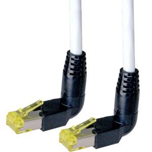 Le cordon RJ45 CAT.6A S/FTP Coudé Bas CAFCA gris est blindé Cat.6A 500 MHz avec connecteurs RJ45 coudés à 90° aux deux extrémités. Gain de place optimal pour les armoires réseau des établissements scolaires et collectivités, disponible sur mesure.