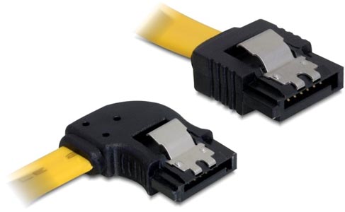 Cordon SATA II coudé gauche à verrouillage métallique, connecteur en L mâle/mâle, débit jusqu'à 3 Gbit/s, longueur 0,50m. Pour les PC et serveurs des établissements scolaires et collectivités.