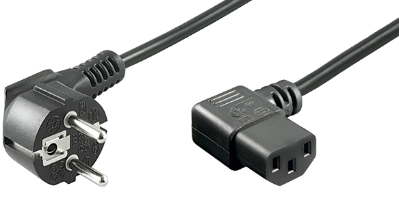 Le cordon secteur C13 noir coudé relie une prise 2P+T mâle coudée à un connecteur C13 femelle coudé. Câble 3x1 mm², idéal pour les équipements positionnés contre un mur dans les salles informatiques des établissements scolaires et collectivités.
