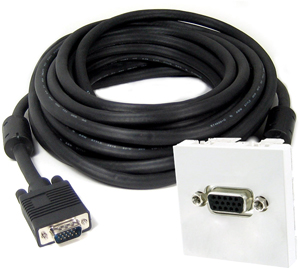 Le cordon VGA CAFCA intégré sur plastron 45x45 relie un équipement VGA à une prise encastrée en goulotte ou boîtier. Connecteur mâle côté cordon et femelle sur le plastron, idéal pour les salles de classe et espaces collectifs.