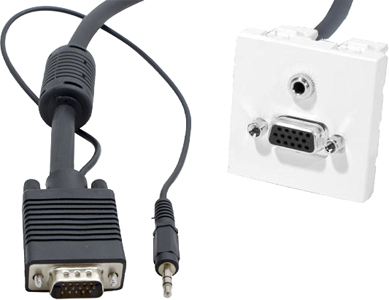 Le cordon SVGA+Jack CAFCA sur plastron 45x45 associe un connecteur VGA HD15 et un jack 3.5mm stéréo pour l'audio et la vidéo. Idéal pour les salles multimédia des établissements scolaires et des collectivités.