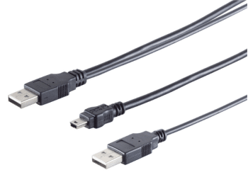 Cordon USB en Y permettant l’alimentation renforcée et la connexion de périphériques Mini USB.