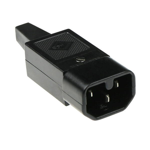 Fiche électrique C16 mâle à câbler, 10A / 250V AC, avec détrompeur et borniers à vis. Température de fonctionnement jusqu'à 120°C. Certifiée CSA, SEMCO, SEV, UL, VDE. Couleur noir.
