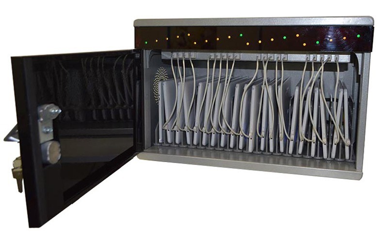 Mobistack 18 Tab est une station permettant de stocker et recharger jusqu’a 18 tablettes 12 pouces Android/iOS, avec cables integres et LED de charge.