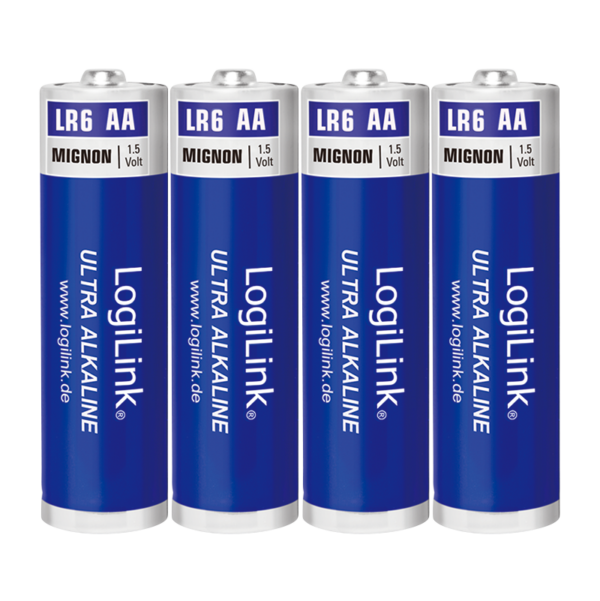 Piles alcalines LR6 AA 1,5V en blister de 4, capacité 1700 mAh, durée de vie jusqu'à 5 ans. Composition Zinc/EMD/hydroxyde de potassium. Marque LOGILINK LR6B4. EAN : 4052792046915.