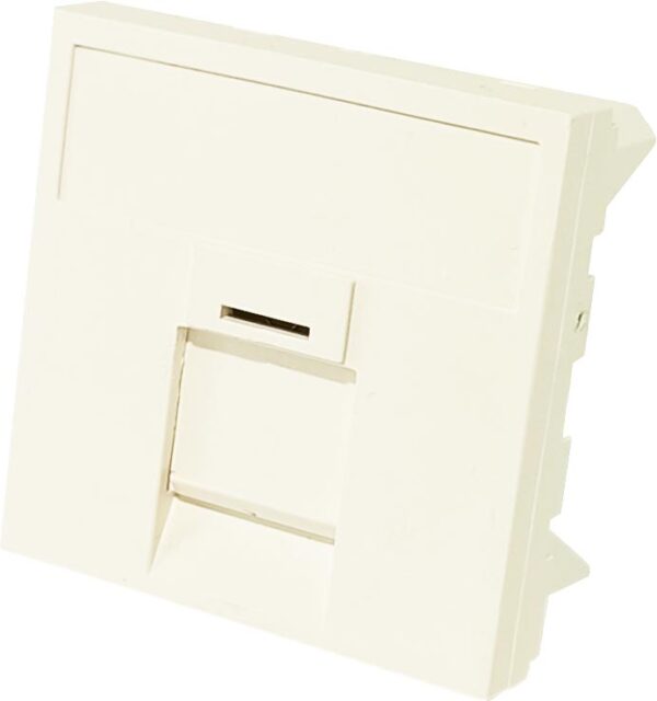 Plastron 45x45 équipé d'une embase femelle RJ12 (6P6C) à contacts auto-dénudants, pour fixation dans boîtier mural ou goulotte. Solution de câblage téléphonique propre et intégrée pour les établissements scolaires et collectivités.
