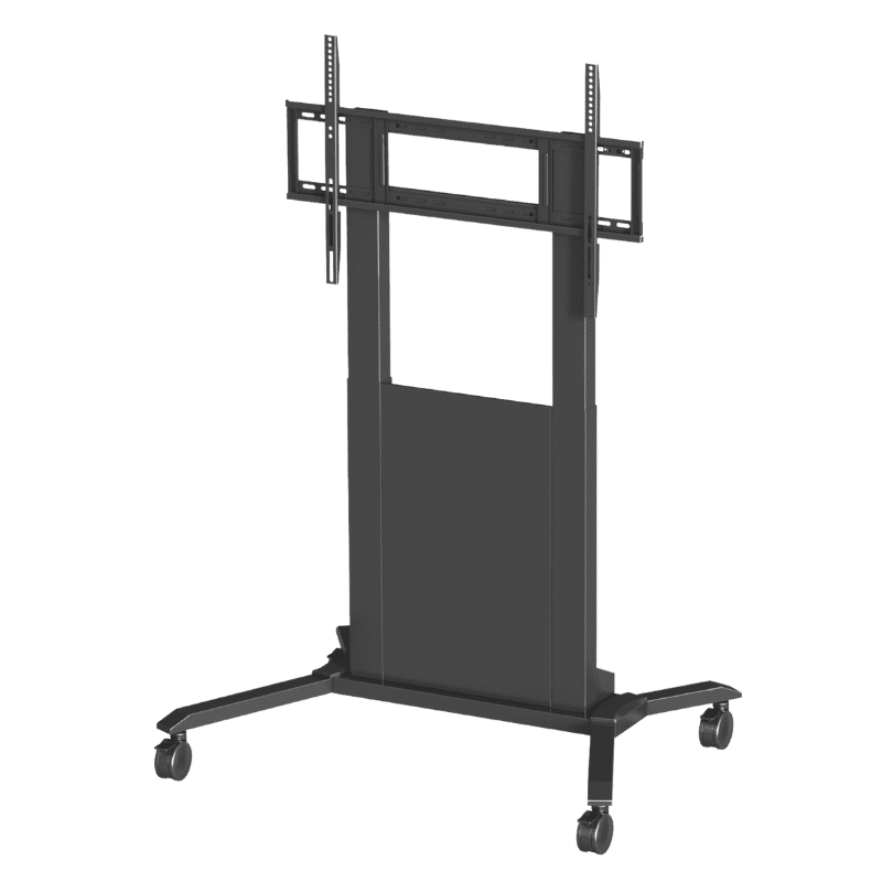 Support mobile motorisé pour écran interactif jusqu’à 86 pouces, avec réglage électrique par télécommande, forte capacité de charge et roulettes sécurisées pour un usage en milieu scolaire et professionnel.