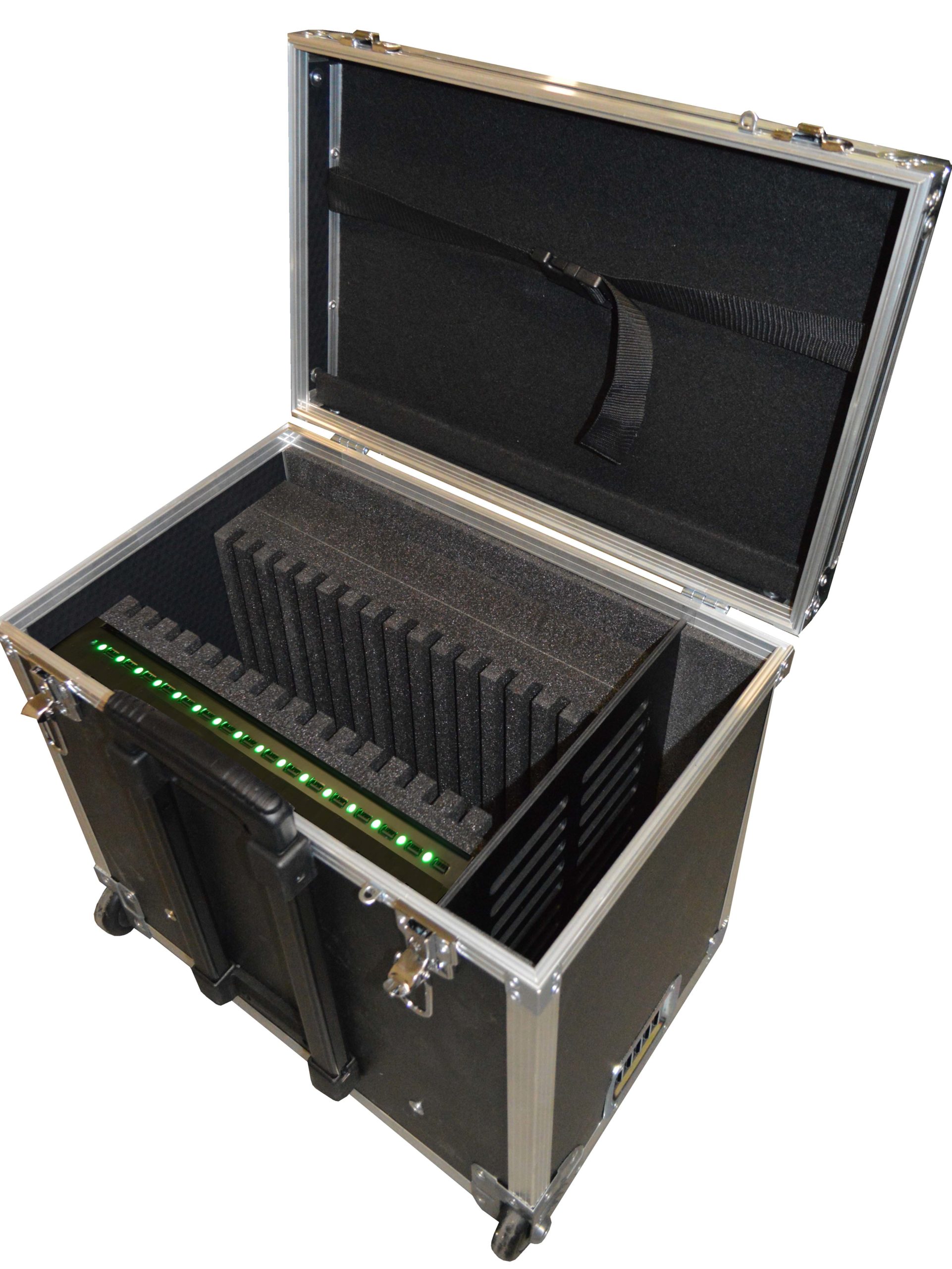 TIP 16 HUB est une valise multimedia flight case permettant de ranger, transporter et recharger 16 tablettes hybrides avec hub de chargement USB integre.