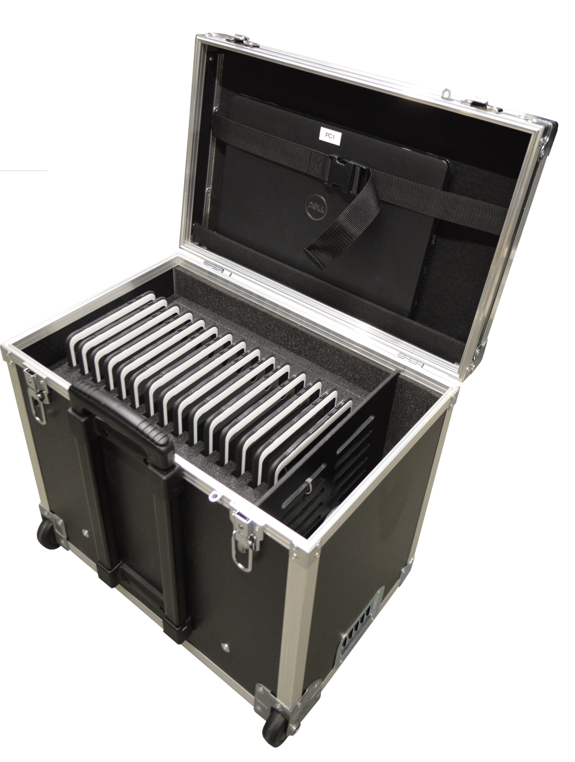 TIP 16 est une valise multimédia flight case permettant de ranger, transporter et charger 16 tablettes hybrides 11.6 pouces avec sécurité renforcée.
