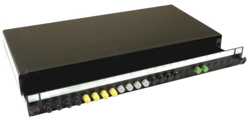 Tiroir optique coulissant 19" 1U noir pour 24 traversées ST ou FC simplex. Acier 1,2 mm, RAL 9004, profondeur 204 mm. Livré nu avec kit de management réf. 702099 et 24 bouchons. Marque CAFCA.
