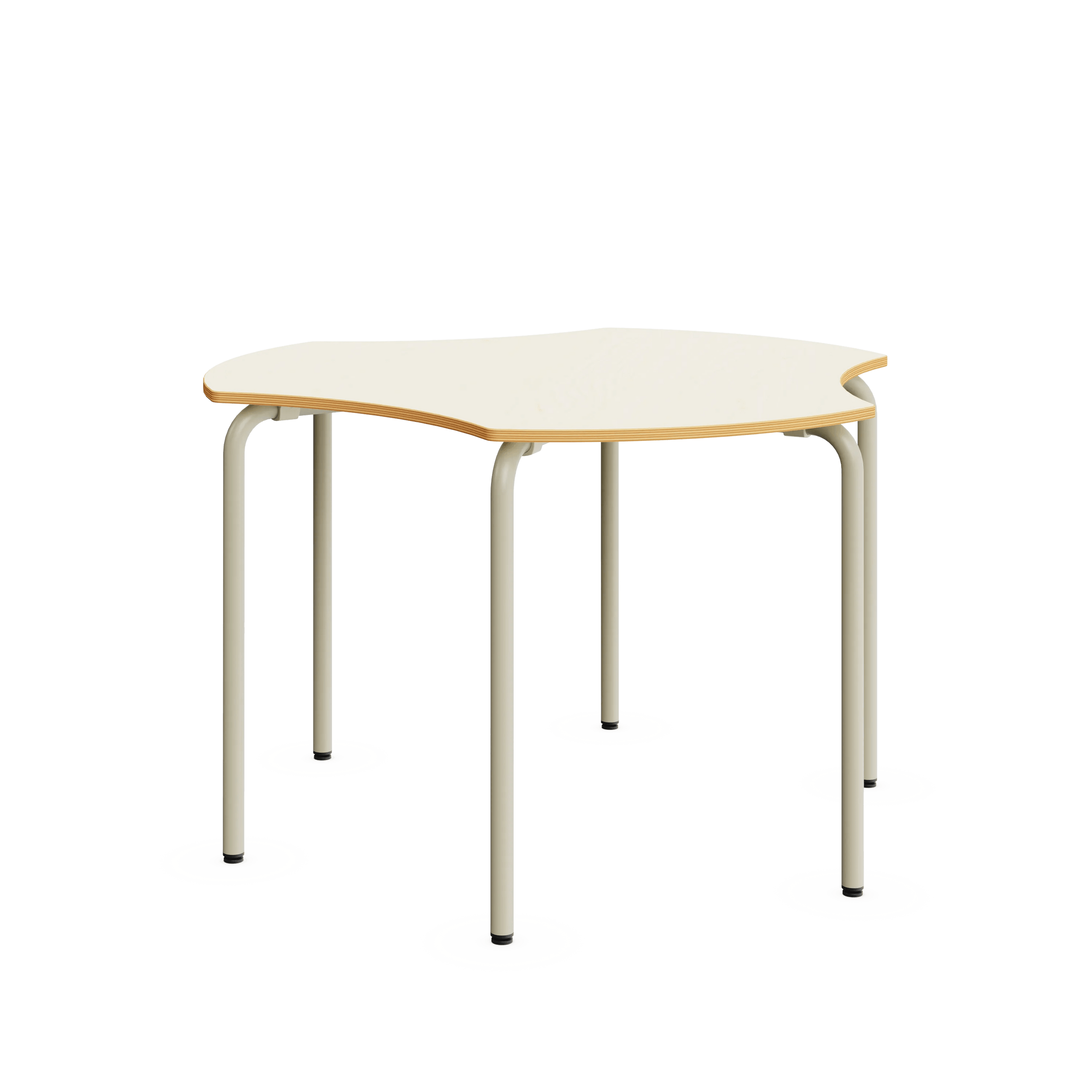 Table TRISIX : table ergonomique au design curviligne, combinant un plateau en MDF et une structure métallique réglable. Sa forme et sa modularité permettent de multiples configurations pour les environnements collaboratifs et éducatifs.