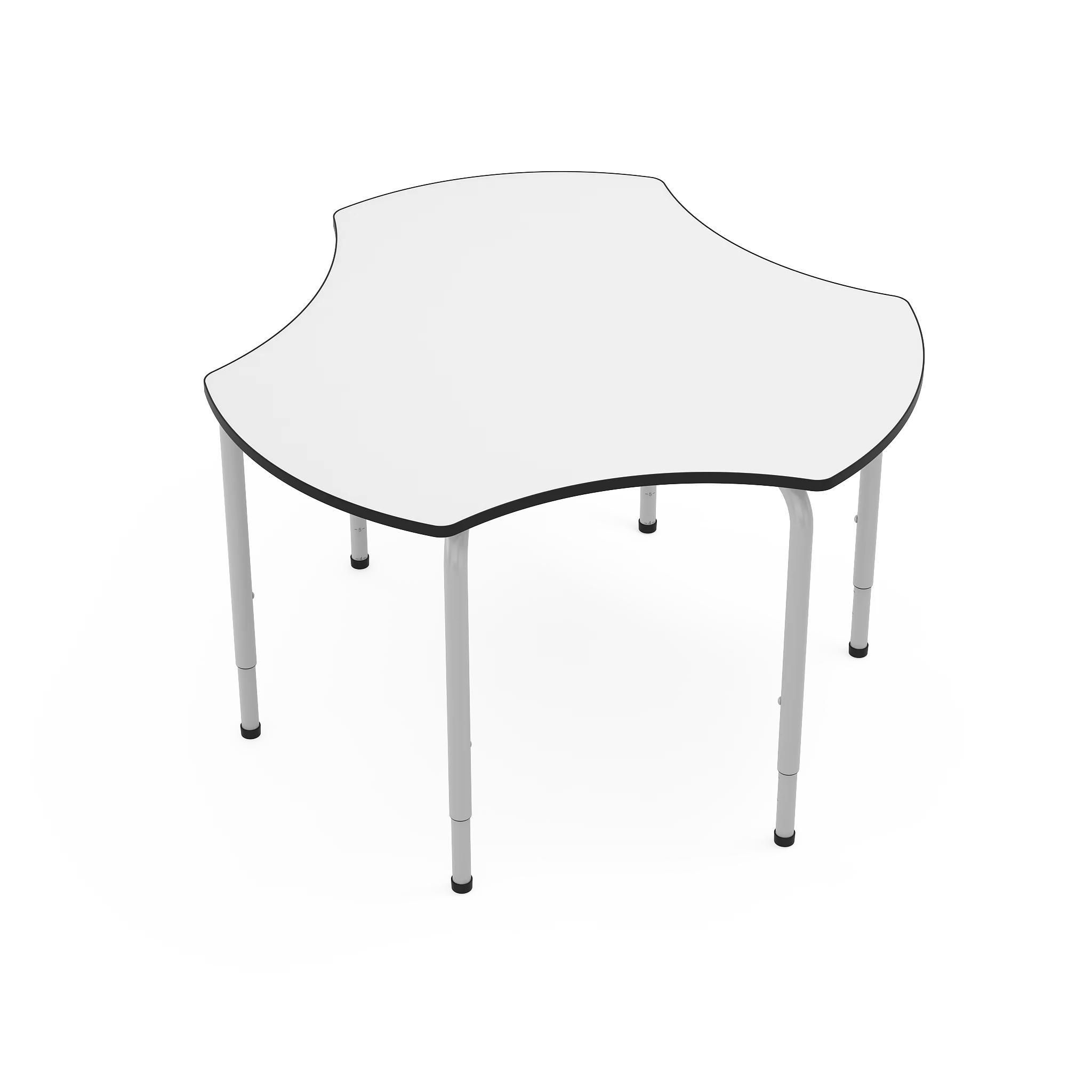Table TRISIX : table ergonomique au design curviligne, combinant un plateau en MDF et une structure métallique réglable. Sa forme et sa modularité permettent de multiples configurations pour les environnements collaboratifs et éducatifs.