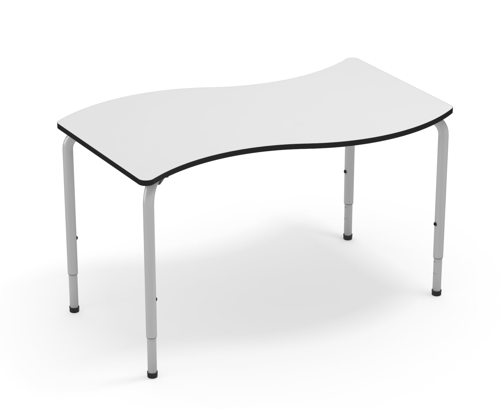 WAVE est une table avec plateau courbé en MDF de 20 mm et structure tubulaire métallique réglable, idéale pour les espaces collaboratifs, salles de classe et zones communes